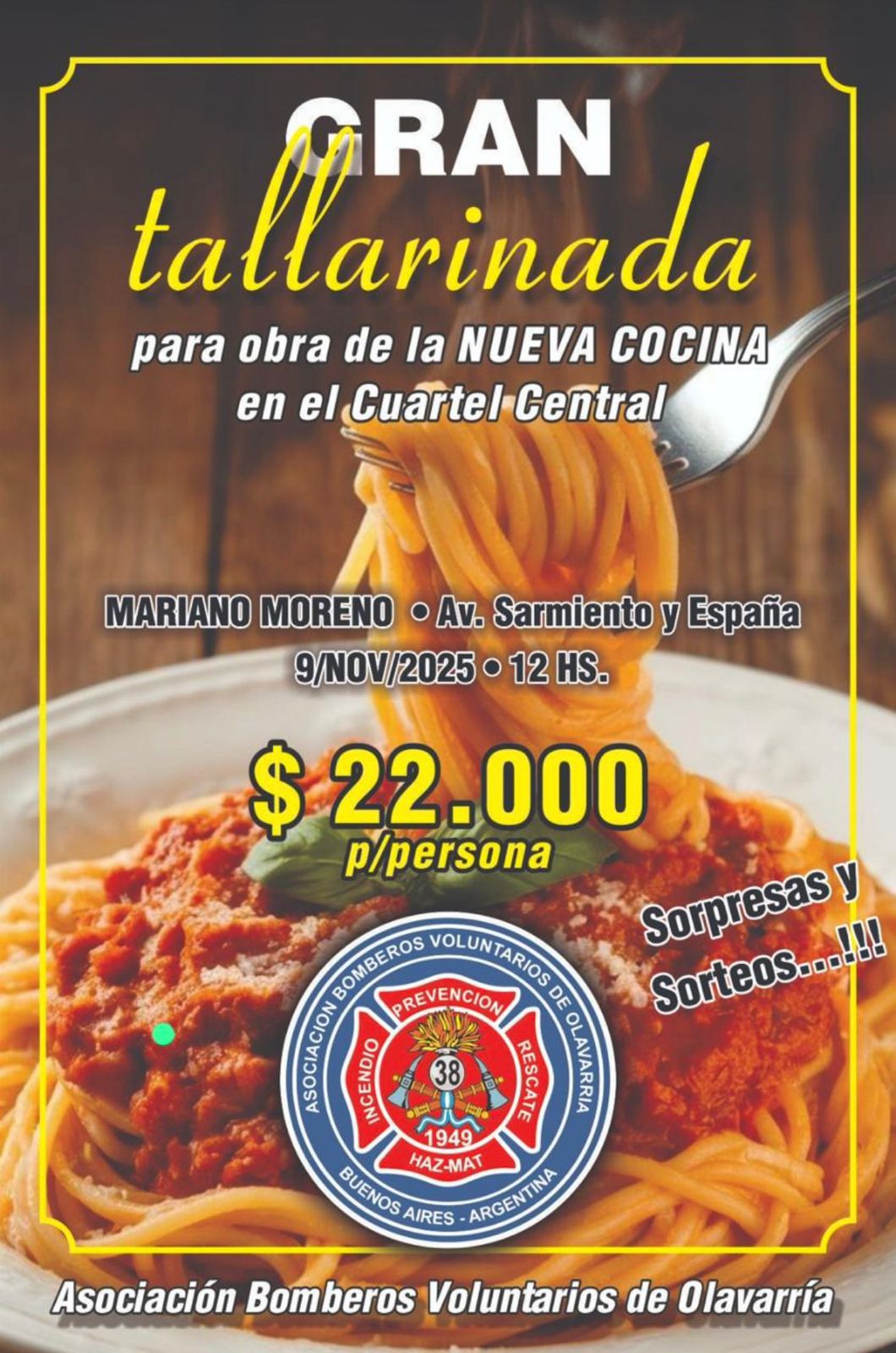 La Asociación de Bomberos Voluntarios de Olavarría invita a la comunidad a participar de una gran tallarinada solidaria, que tendrá lugar el sábado 9 de noviembre a las 12 hs en el Club Mariano Moreno, entre Av. Sarmiento y España.